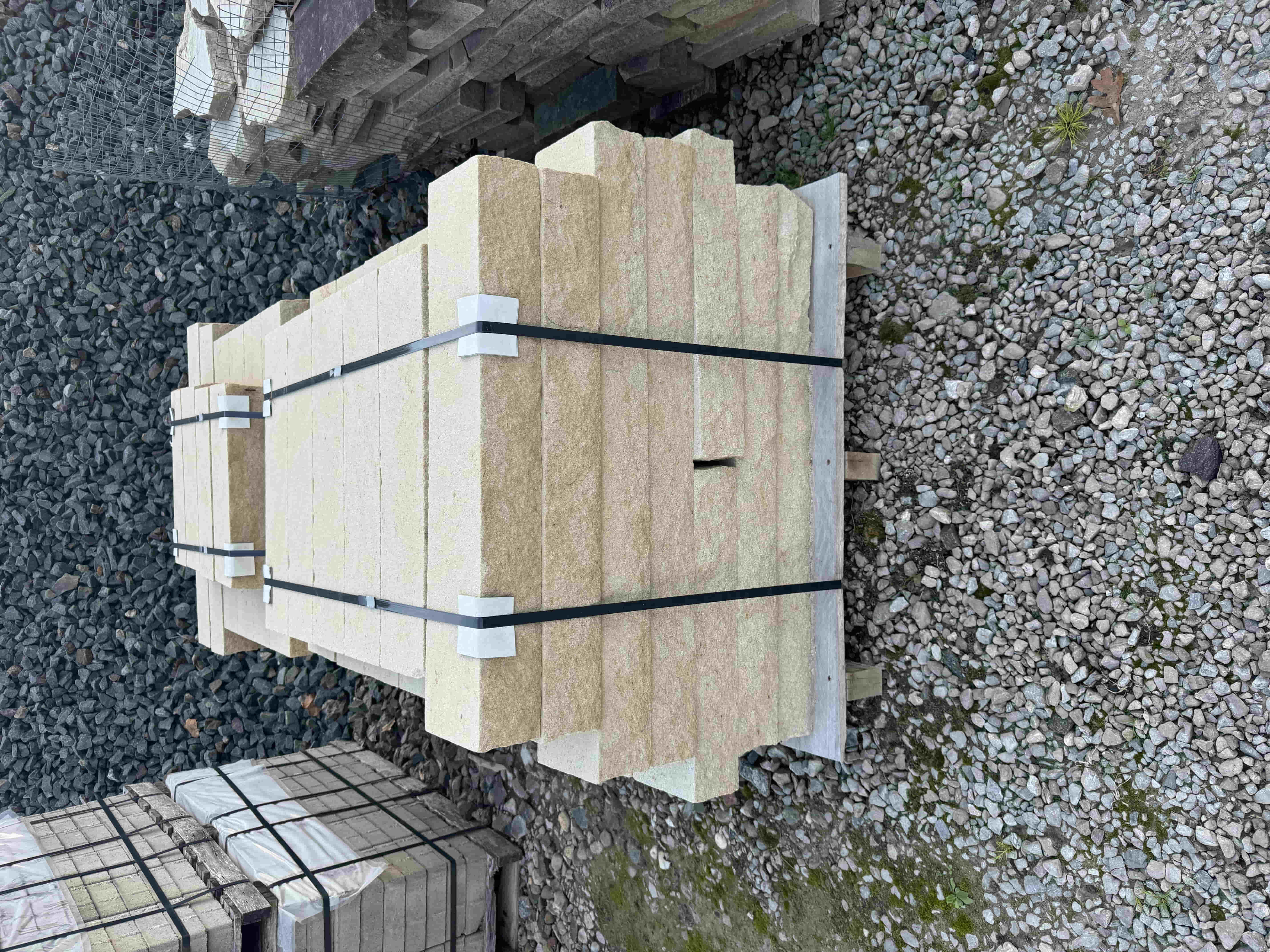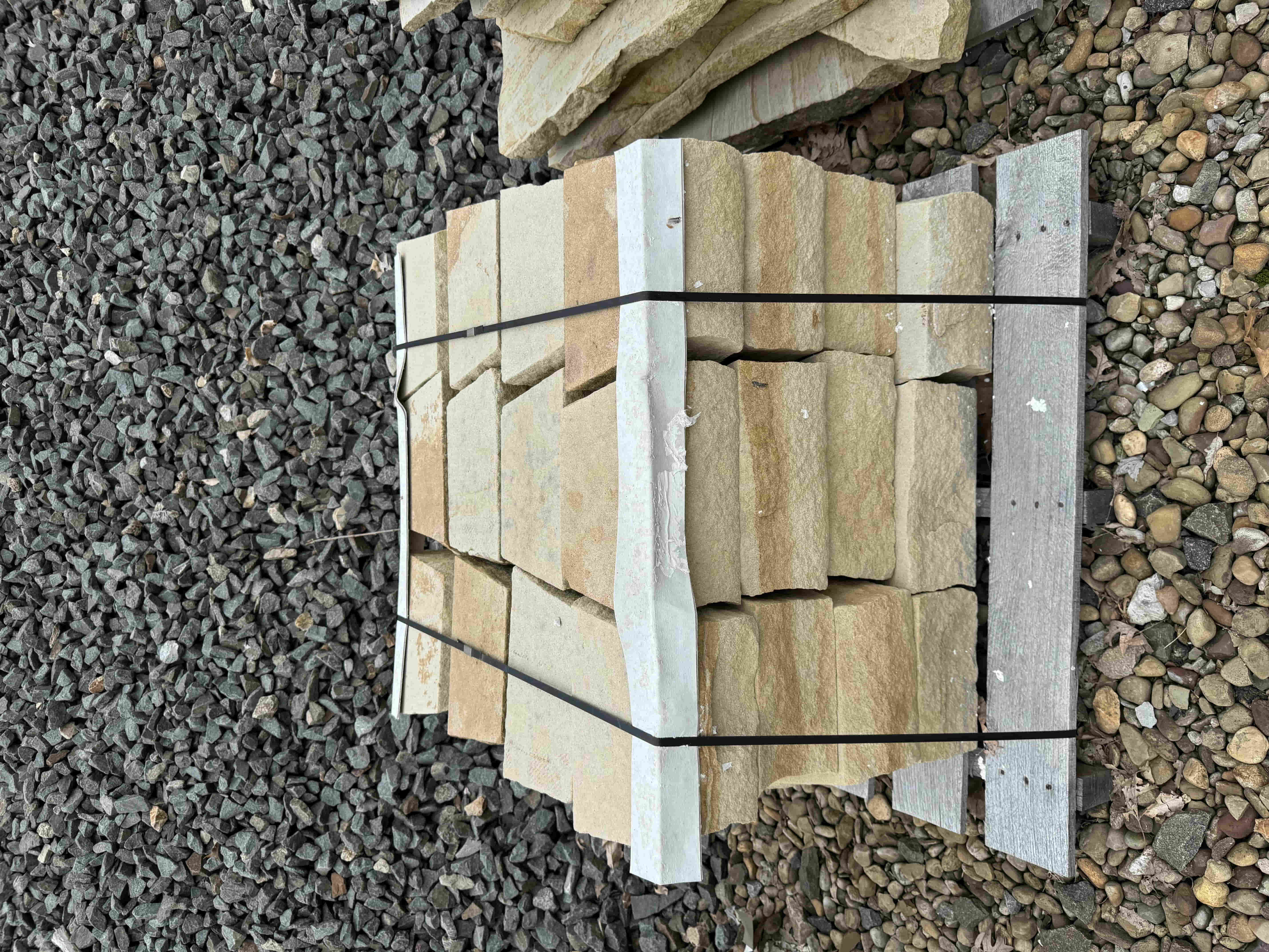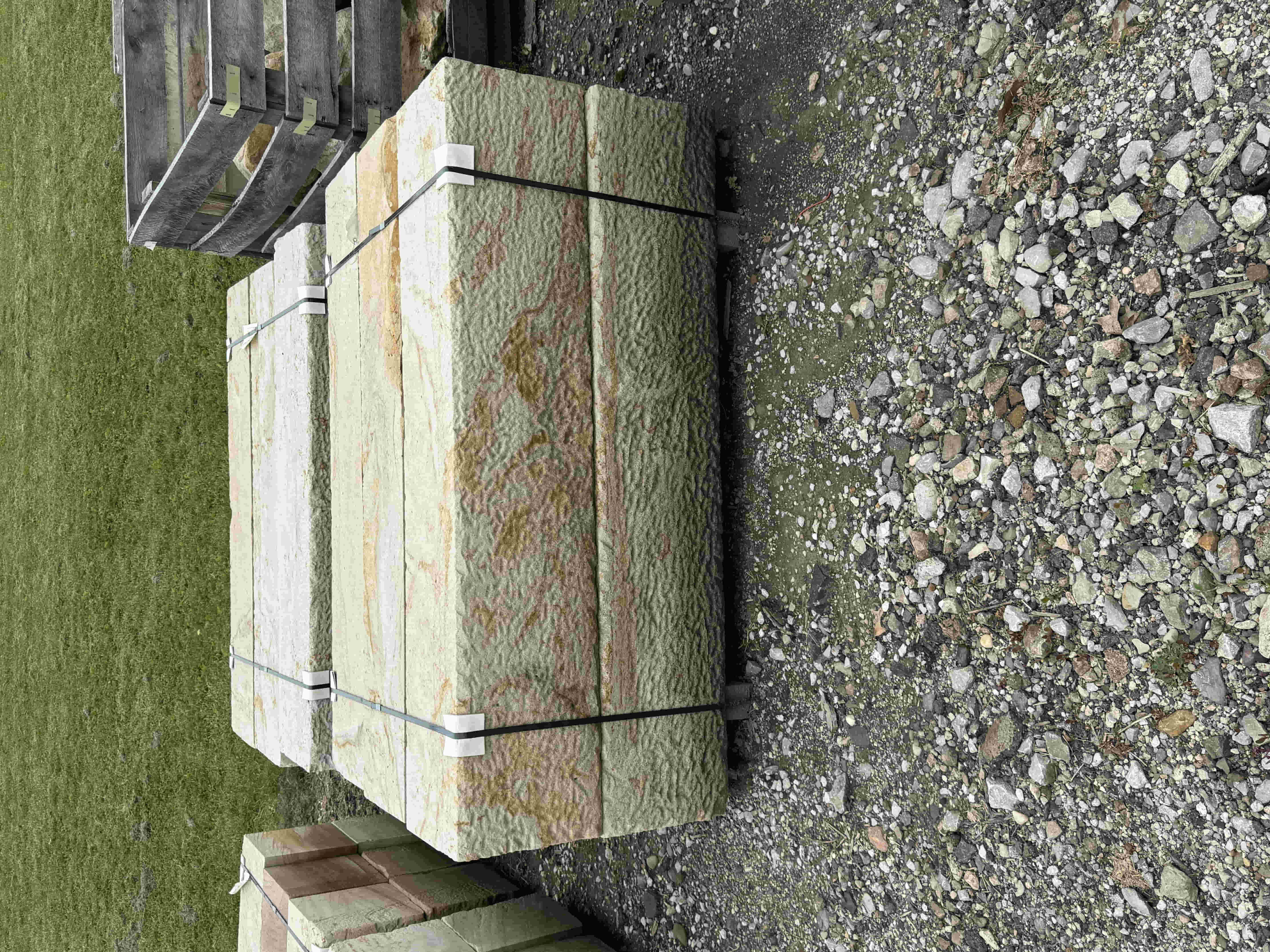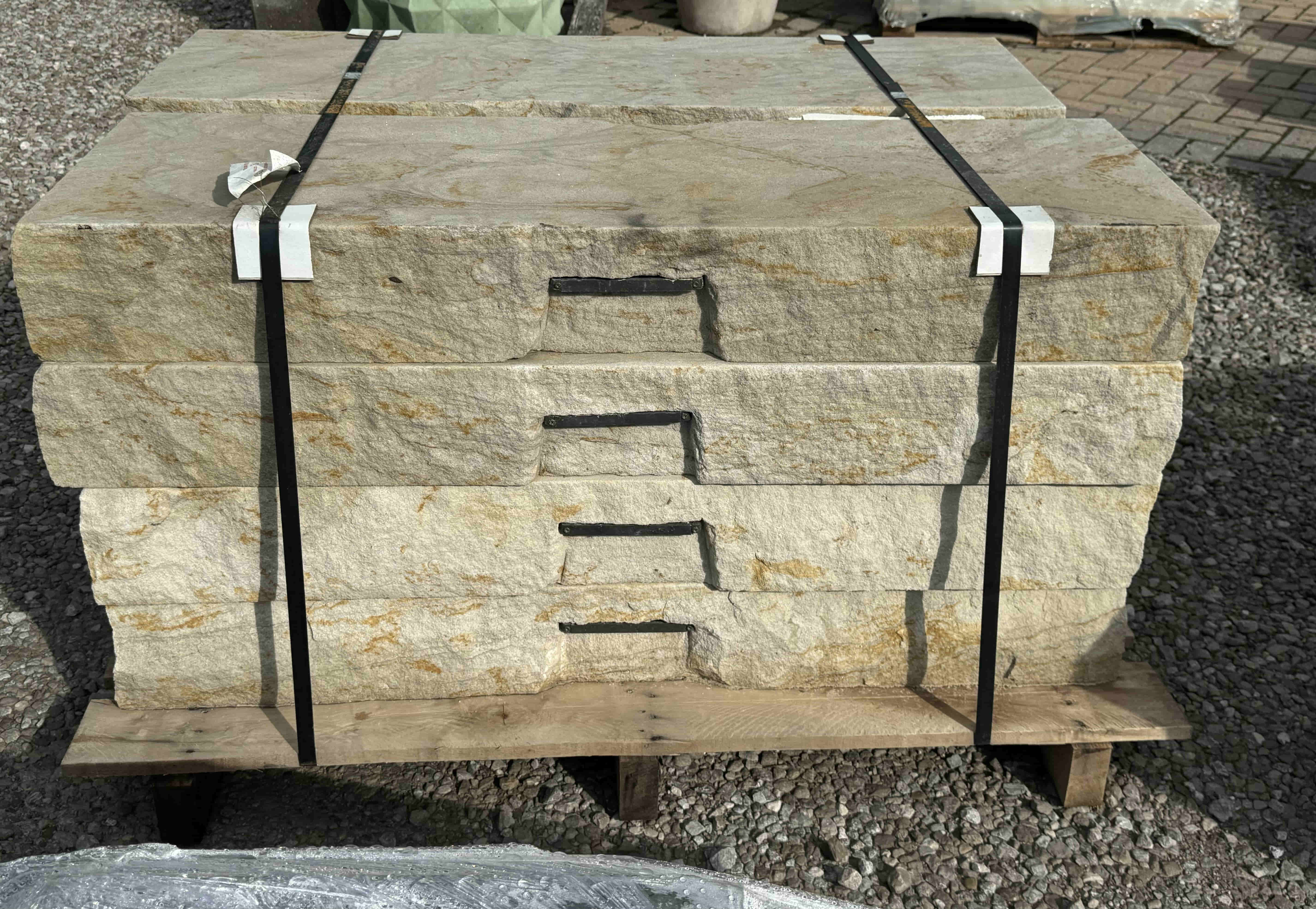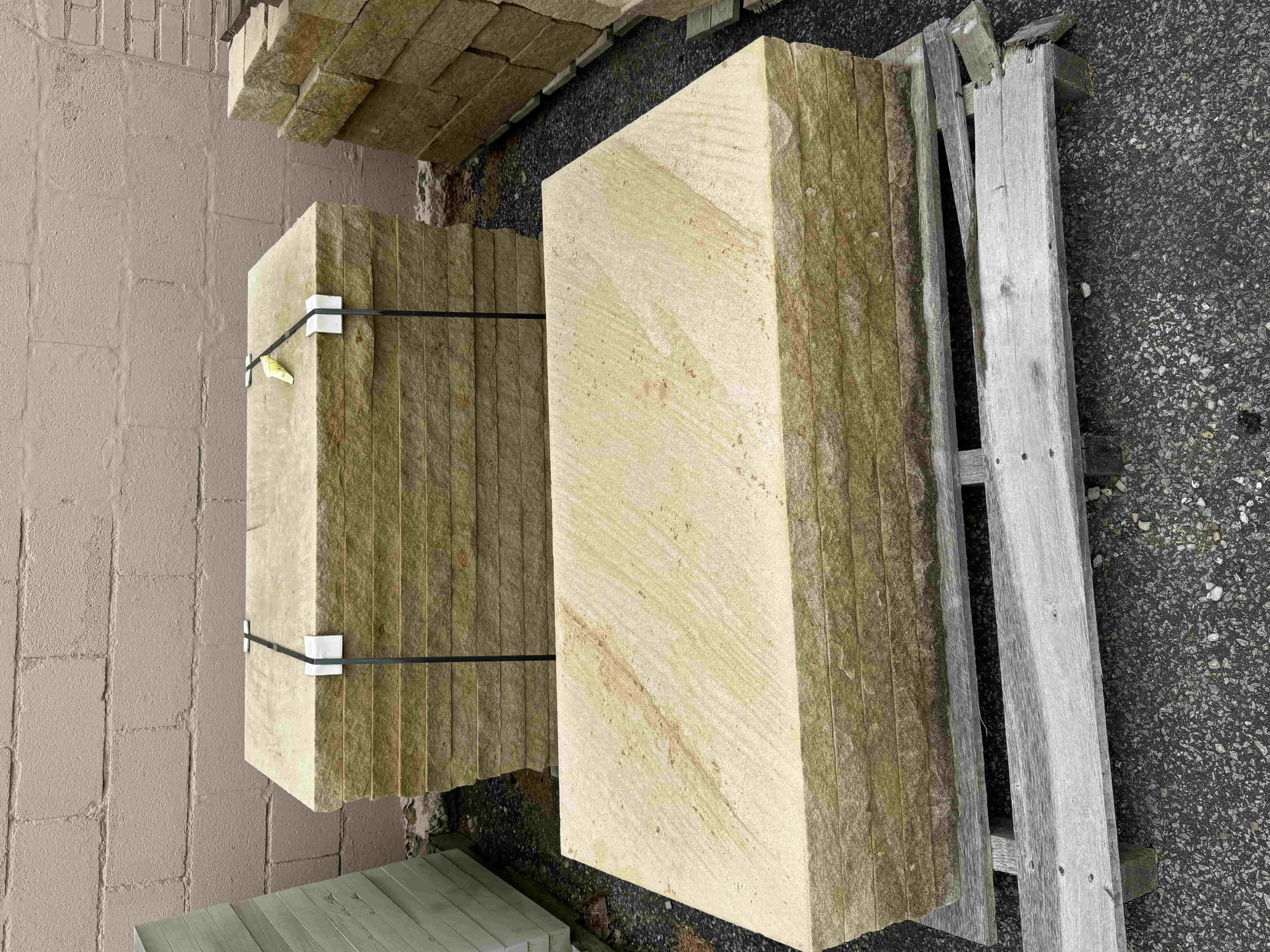 Briar Hill Sandstone is sold by the piece or by the pallet. It is used for walls, coping, patio, or steps.